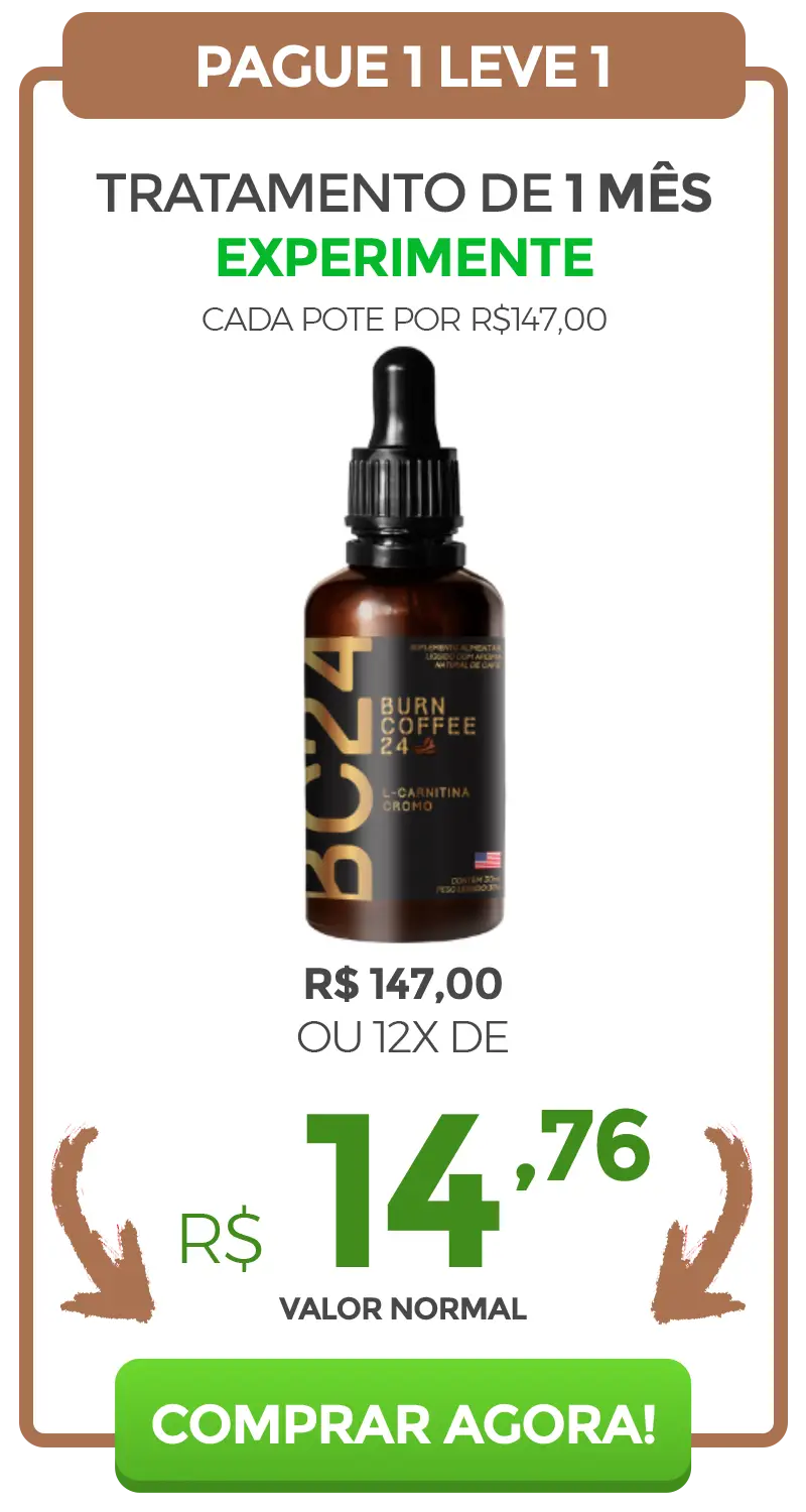 O Burn Coffee 24 funciona como um “ímã” que suga toda a gordura em excesso do seu corpo. Pouco a pouco, a fórmula remove manualmente a gordura indesejada da barriga, dos braços, interior da coxa, e a “papada” do queixo. Você vai poder finalmente voltar a usar as roupas que você realmente quer, e sentir a sensação de que SIM, você finalmente conseguiu emagrecer!