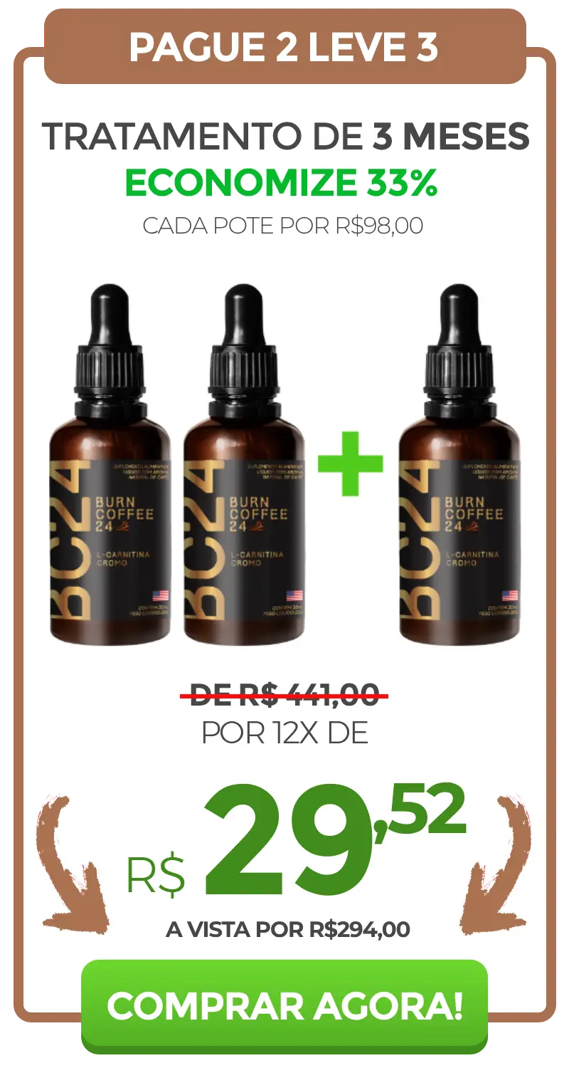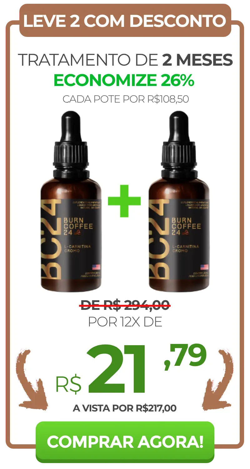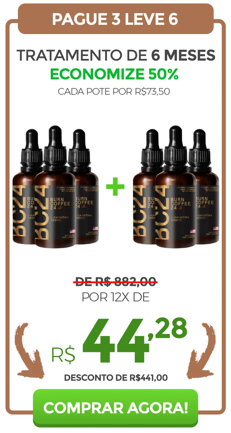 O segredo do Burn Coffee 24 está na presença de fibras especiais em sua fórmula em gotas, que se conectam às gorduras presentes no seu corpo. O incrível efeito do Burn Coffee 24 assemelha-se a uma lipoaspiração natural, pois essas fibras em gotas atuam como verdadeiros "removedores" de gordura, auxiliando na sua redução de forma natural. E tem mais uma boa notícia: ao parar de utilizar o produto, você não corre o risco de um efeito rebote!